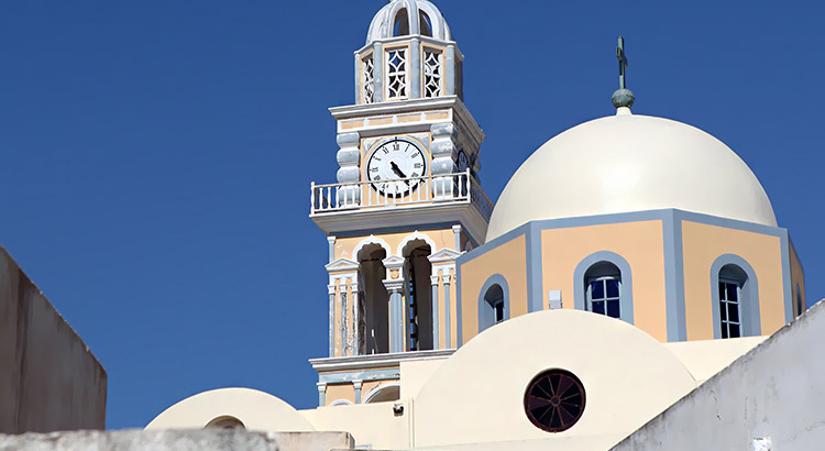 Most of Santorini’s churches have white washed walls in keeping with the Cycladic custom. However, certain structures show the influence of other architectural styles. The Catholic Cathedral of St. John the Baptist is just one of those, with peach coloring and blue molding. It’s built in a stately Baroque style, with a clock tower that sets it apart entirely from its similar churches. It’s located in the heart of a Catholic neighborhood in Fira, Santorini.