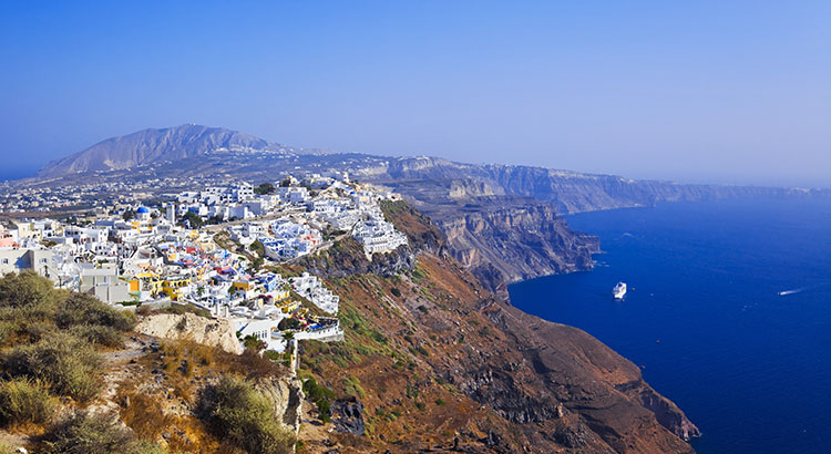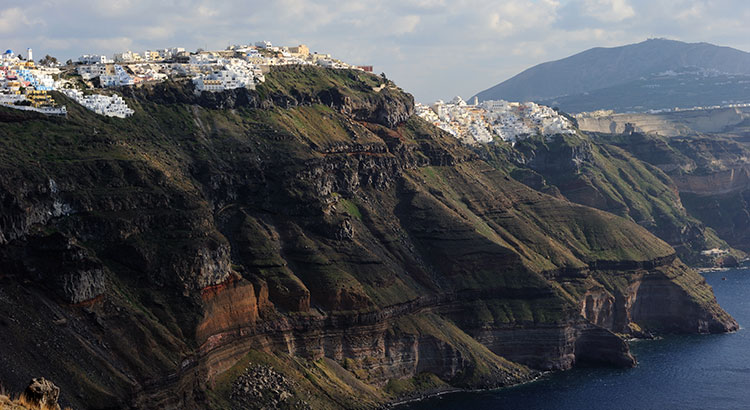 The nearest cities to the caldera are Oia and Fira. Oia, the most popular tourist city, is built on top of the northernmost cliffs overlooking the caldera. If you want great hotels with amazing views of the caldera in Santorini, Oia is the place to go. Fira is located atop the eastern cliffs of the caldera and also provides terrific panoramic views of the caldera with less crowds. Both Oia and Fira are full of great bars, restaurants, and other accommodations and entertainment for tourists.