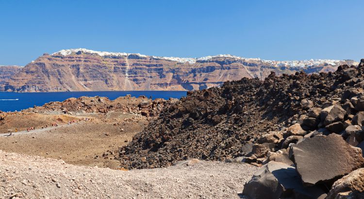 After exploring Nea Kameni’s volcanic craters, your voyage continues to the nearby Palea Kameni, famous for its therapeutic hot springs. A sense of adventure meets relaxation as you take a refreshing dip into these naturally warm waters, tinged green by sulfur and iron.