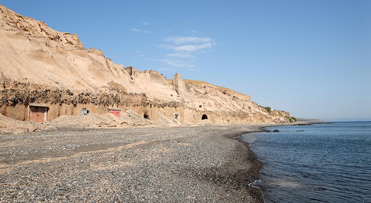 Monolithos is known for its famous beach of the same name. The black sand beach is full of interesting rock structures, clear and calm water, and shallow swimming that makes it perfect for the whole family. If you’re dreaming of a beach wedding, Monolithos is a wonderful place to host it. But the village gains its name not from the beach but from the large rock, Monolitho, that stands over the beach. At the top of this rock is the church of Agios Ioannis, though the church is considered to be in Fira. When you take a day to visit Monolithos beach, you can refresh yourself at one of the nearby fish taverns or other restaurants. Monolithos is also home to the only remaining operational Tomato Canning Factory on Santorini Island. Monolithos can be reached from Fira by bus.